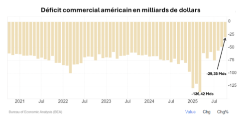 C’est là tout le cœur du sujet. Les droits de douane ne se contentent pas de générer des recettes, ils redessinent les flux commerciaux. Les derniers chiffres du département du Commerce montrent que le déficit commercial américain s’est réduit à 29,4 milliards de dollars en novembre, son plus bas niveau depuis 2009. Non pas parce que les exportations explosent, mais parce que les échanges globaux se contractent. Le shutdown de l’administration à l’automne a retardé la publication de ces données, mais le message est limpide : il y a moins de commerce entrant et sortant des États-Unis.
