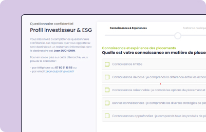 Les exigences réglementaires évoluent : les conseillers doivent désormais intégrer les préférences ESG (Environnement, Social, Gouvernance) aux devoirs de conseil. Wizio propose donc un questionnaire complet, digitalisé et conforme, comprenant :